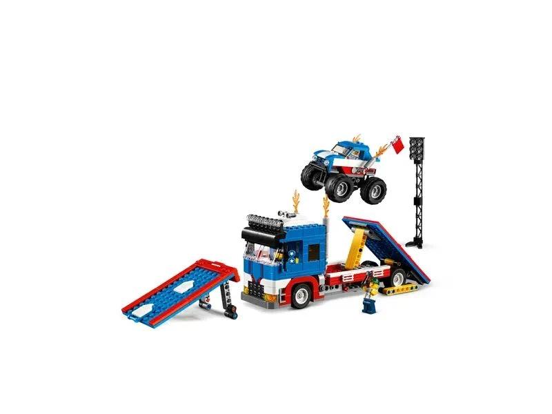¡Sube con el camión monstruo hasta el camión de transporte y ponte en marcha hacia un nuevo y emocionante espectáculo acrobático!