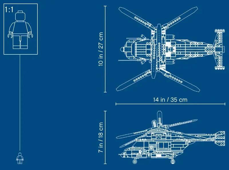 El Helicóptero de Doble Hélice de juguete mide más de 17 cm de altura, 37 cm de longitud y 33 cm de ancho.