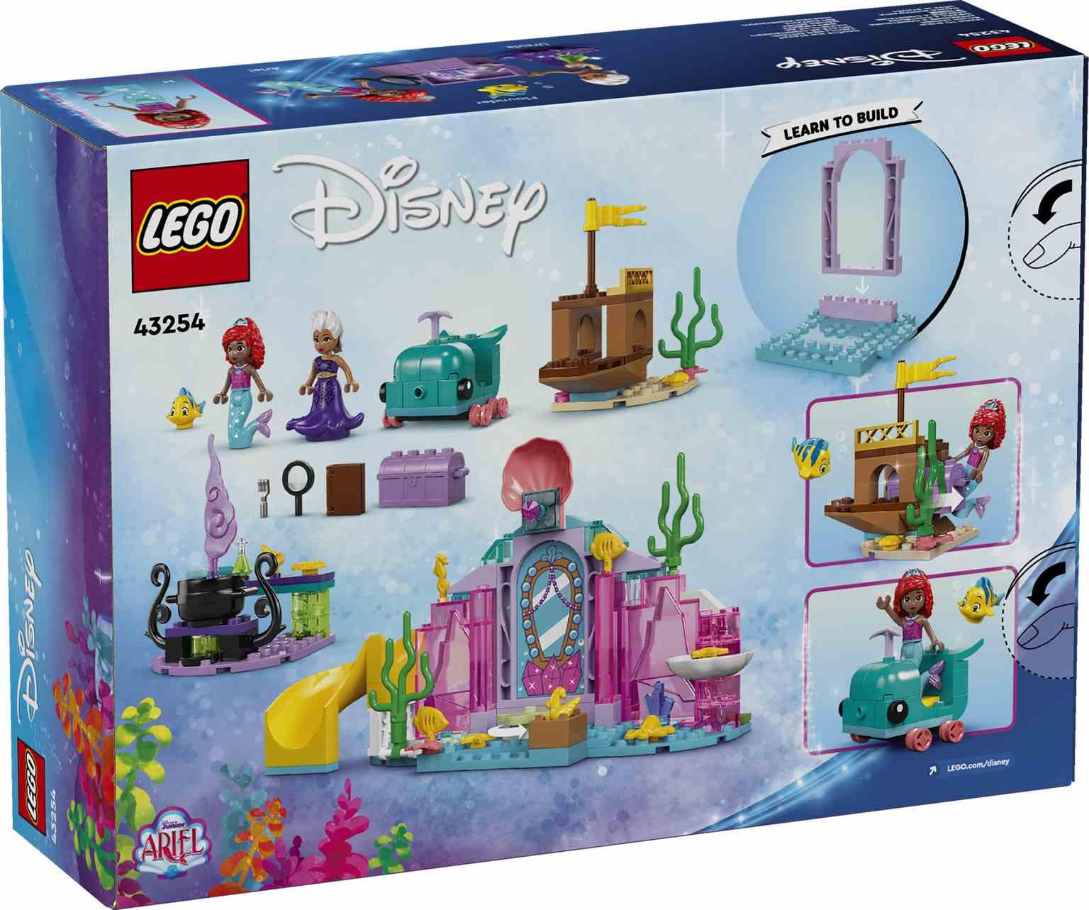 La exploración y el juego esperan a las niñas y los niños de 4 años o más mientras aprenden a construir con el juguete LEGO® ǀ Disney Princess Gruta de Cristal de Ariel (43254). Este set construible, ideal como regalo, ayuda a potenciar las habilidades de resolución de problemas de los peques mediante el juego creativo. Dentro hay una gruta con una plataforma giratoria y un tobogán, un vehículo-ballena, un naufragio con un cofre del tesoro y un caldero. Incluye también minipersonajes LEGO ǀ Disney de Ariel y Úrsula, además de una figura LEGO ǀ Disney del pez Flounder.El kit de construcción trae un ladrillo para principiantes que agiliza la construcción e instrucciones en forma de colorida historia visual para los niños que están empezando a leer. Este set de construcción LEGO 4+ es fácil de llevar a las reuniones con amigos y permite a adultos y peques divertirse construyendo juntos. Combina genial con otros sets LEGO 4+ y juegos LEGO ǀ Disney de la gama (a la venta por separado).
