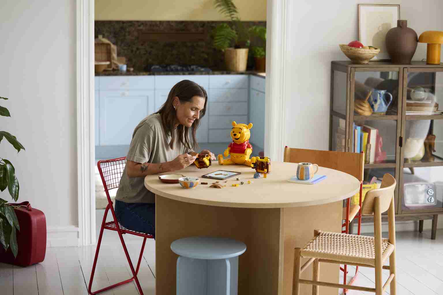 Winnie the Pooh, el personaje de la película Disney clásica que aparece sentado en este set de construcción LEGO® ǀ Disney de 1399 piezas, mide aproximadamente 23 cm de altura.