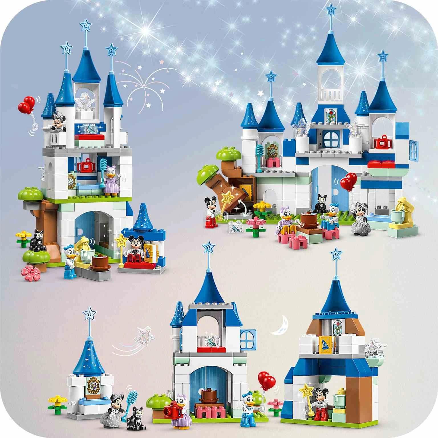 Incluye 5 figuras LEGO DUPLO de Mickey Mouse, Minnie Mouse, el Pato Donald, Daisy y Figaro el gato de Disney para explorar el castillo Disney de juguete 3 en 1.