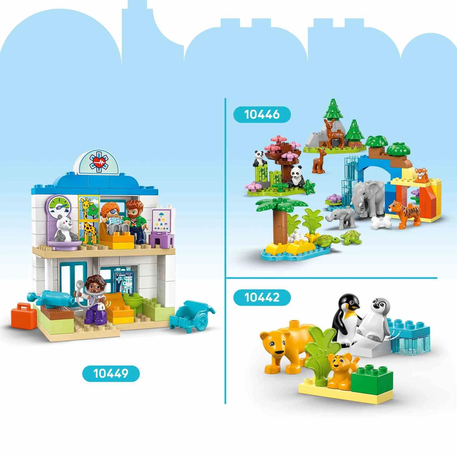 ¡Embárcate en un alegre viaje de aprendizaje con tu bebé de 2 años o más con este simpático juguete de construcción que os lleva desde la Antártida hasta África! El set Familias de la Fauna Salvaje: Pingüinos y Leones (10442) estimula la imaginación con 2 pingüinos y 2 leones de juguete LEGO® DUPLO® que invitan a divertirse jugando con creatividad durante horas. Señala las diferencias entre los padres y los bebés, y entre los climas cálidos y fríos. Ayuda a tu peque a expresar su naturaleza protectora interpretando cómo el animal adulto cuida de su cría. Muéstrale que, como a ti, a los papás les encanta jugar con sus bebés. Además, mientras construís juntos un tobogán de hielo para los pingüinos y praderas para los leones, tu preescolar desarrolla sus habilidades motrices finas. Los juguetes para niños pequeños LEGO DUPLO con animales combinan narrativas divertidas, vivos colores y figuras de juguete diversas para fomentar el desarrollo social y emocional de la forma más entretenida.