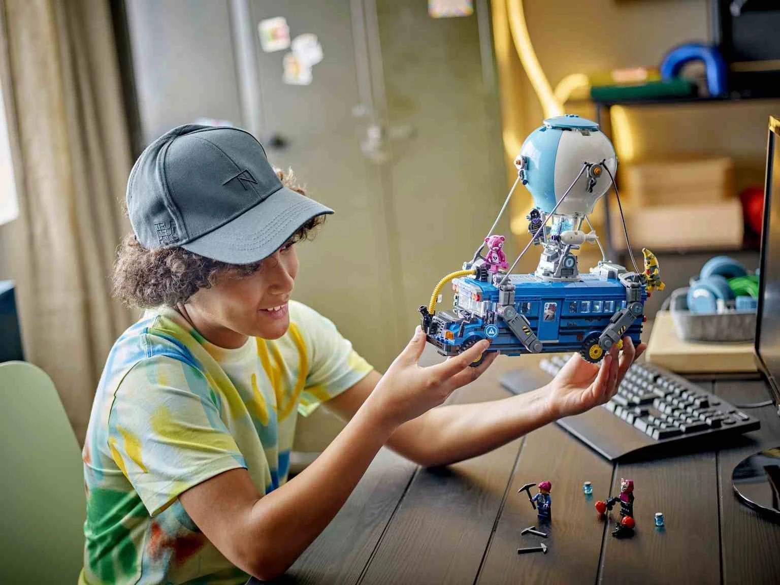 ¿Preparado para viajar al increíble mundo de LEGO® Fortnite®? Diviértete construyendo el alucinante Autobús de batalla antes de llevarlo a dar una vuelta. Inspirado en el vehículo del videojuego, este autobús tiene ruedas que giran, un techo desmontable, ¡y un globo aerostático genial! Trae lanzaventosas, sorbete, picos y zumo de subidón, ¡además de 9 minifiguras de trajes que te encantan!