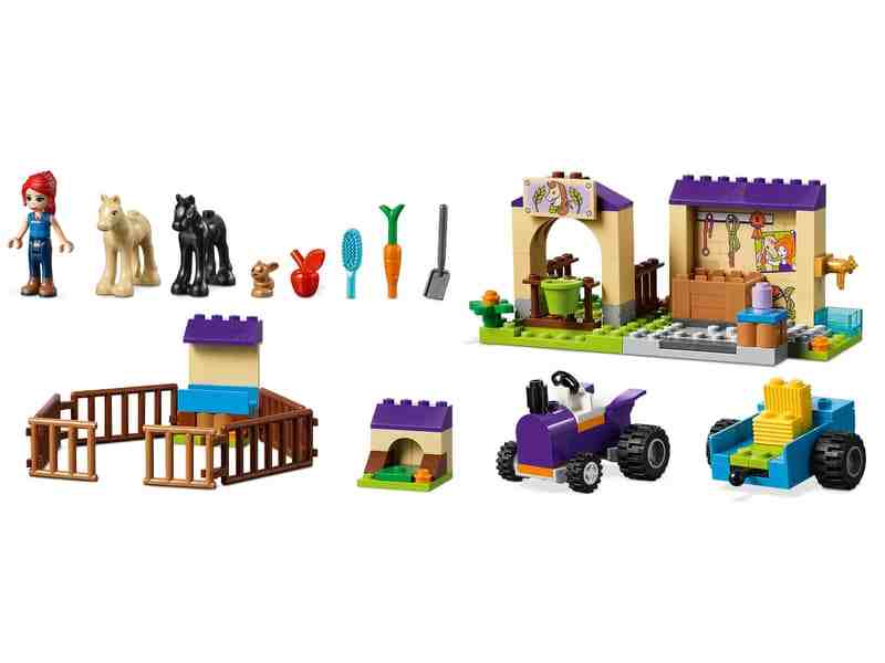 Ayuda a LEGO® Friends Mia a cuidar de sus potros y el conejito en el establo. Conduce a Dolly y a Fame hasta el cercado para que puedan estirar las patas. Cuando vuelvan a las cuadras, dales una manzana o una zanahoria mientras los cepillas y acicalas para que luzcan mejor que bien, y súbete después al tractor para traerles un poco de heno sobre el que puedan descansar.