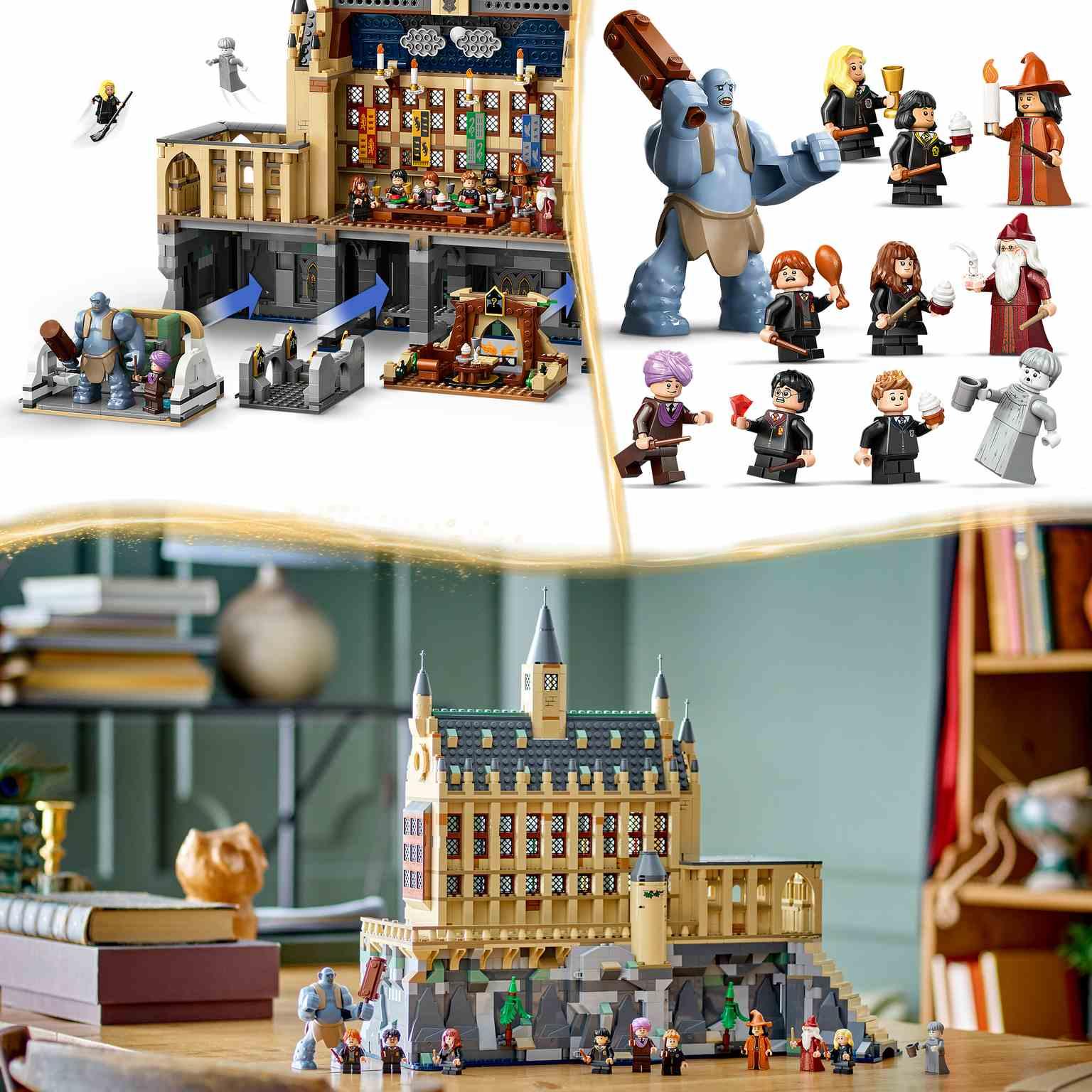 Invita a tu joven mago, bruja o Muggle™ a unirse a los alumnos y profesores en el Gran Comedor con este épico juego de juguetes LEGO® Harry Potter™ inspirado en el Castillo de Hogwarts™ (76435). El modelo del castillo, un mágico regalo para niños,niñas y fans de Harry Potter a partir de 10 años, alberga la recreación LEGO del Gran Comedor más grande que existe, repleta de fieles detalles, como velas flotantes y el techo encantado que refleja el cielo exterior. Explora el patio y la mazmorra, co n una entrada secreta y 3 espacios: un baño, un corredor y la sala común de Hufflepuff™, que puedes extraer. Este set coleccionable incluye 11 personajes, entre ellos Harry Potter, Hermione Granger™, Albus Dumbledore™ y un trol de montaña, además de 5 cuadros de Hogwarts coleccionables (aleatorios, de 14 posibles). El juego pertenece a una colección de sets LEGO Harry Potter modulares (a la venta por separado) que, conectados, crean la escena del Castillo de Hogwarts más detallada hasta ahora.