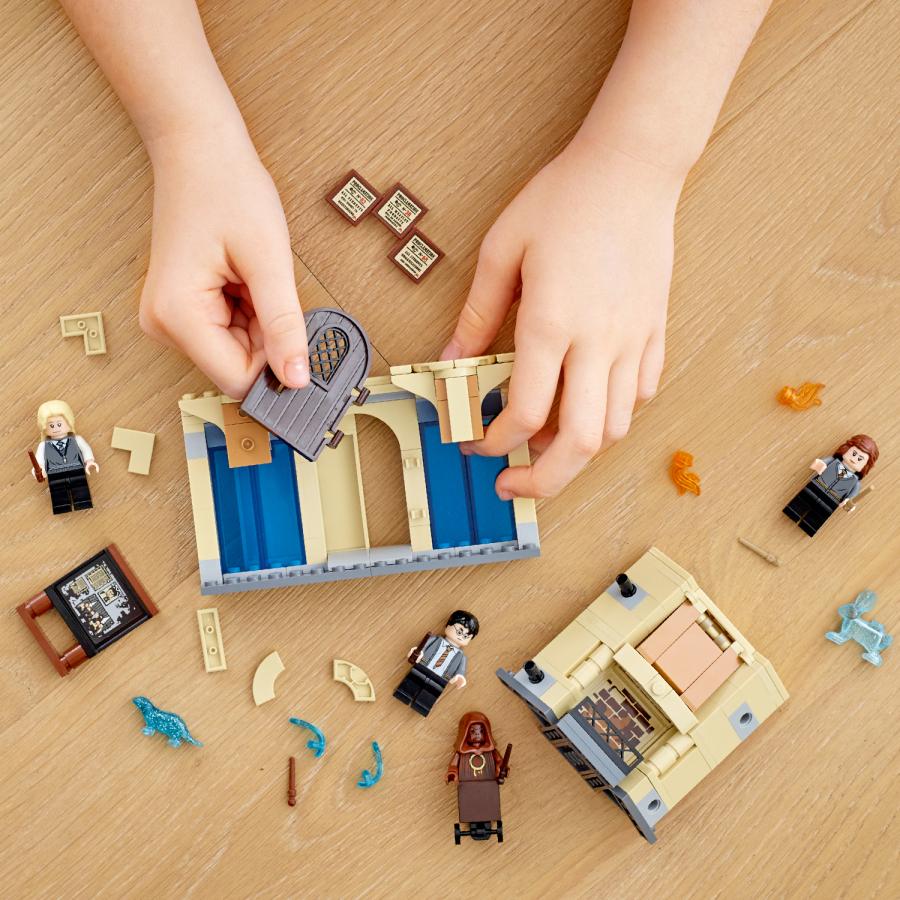 • Incluye 3 minifiguras con varitas (Harry Potter™, Hermione Granger™ y Luna Lovegood™), 2 Patronus con forma de animales, una ráfaga de magia, un maniquí que representa a un Mortífago y una detallada sala con una columna, una pizarra y una chimenea.