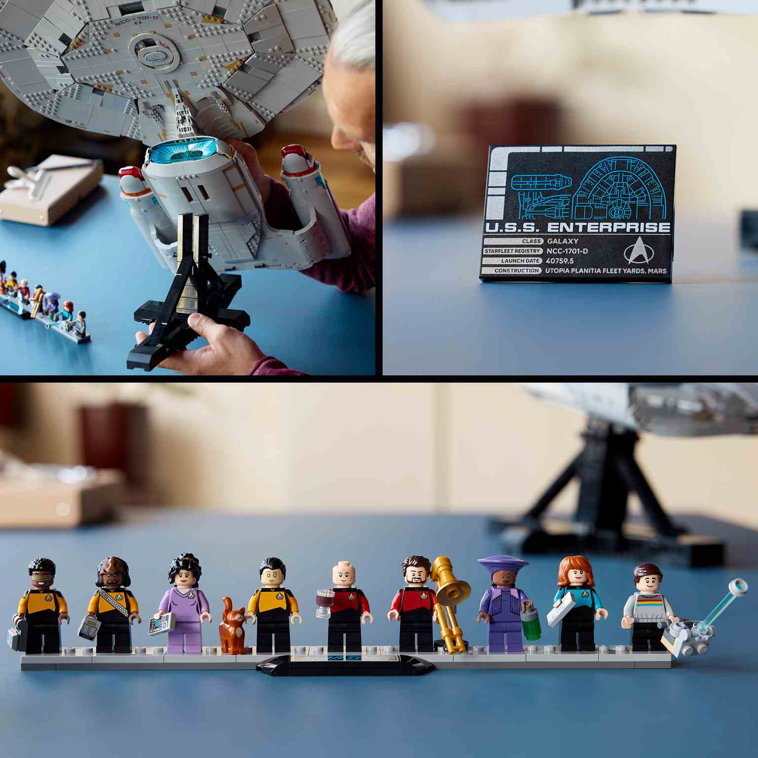 Incluye 9 minifiguras y una base para exponerlas con el grafismo de Star Trek: La nueva generación. Encontrarás al Capitán Jean-Luc Picard, el Oficial William Riker, el Teniente Worf, el Teniente Comandante Data, la Dra. Beverly Crusher, el Teniente Geordi La Forge, la Consejera Deanna Troi, la encargada del bar Guinan y Wesley Crusher. Y también accesorios: taza, trombón, fáser, tricorder, maletín de ingeniería, PADD, botella y generador de haz tractor portátil, además de una figura de un gato.