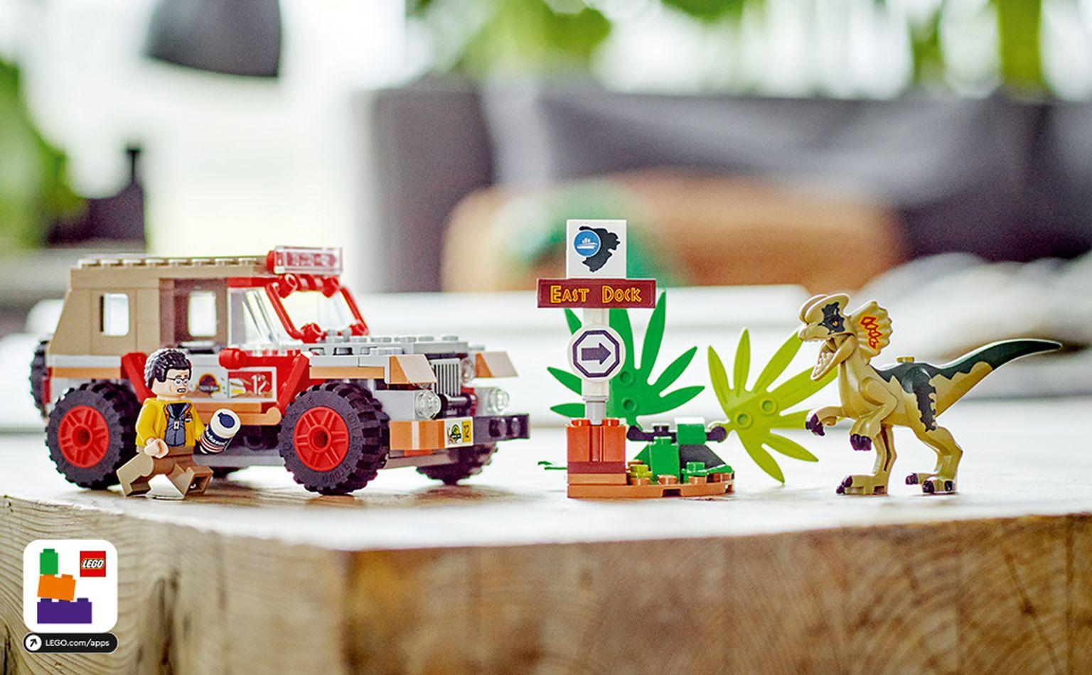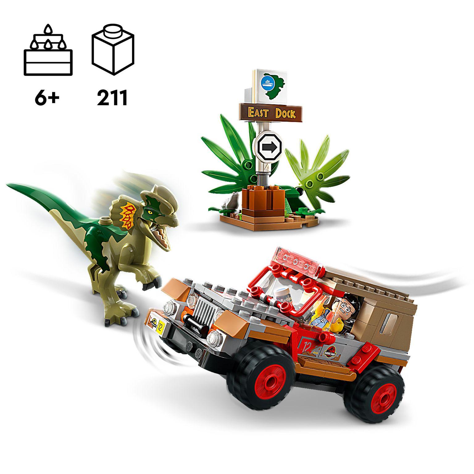Los peques podrán recrear una escena clásica de Parque Jurásico e interpretar sus propias historias con el set de construcción de juguetes coleccionables LEGO® Jurassic World Emboscada al Dilofosaurio (76958). Este fantástico regalo para niños y niñas a partir de 6 años incluye una figura de un Dilofosaurio y un Jeep® de juguete construible como el que aparece en Parque Jurásico, con asiento del conductor para la minifigura de Dennis Nedry y decorado con huellas de dinosaurio y una minifigura llena de barro. Contiene también un pequeño modelo que representa la jungla, una señal con la leyenda “East Dock” que el Jeep puede derribar al chocar, como sucede en la película, y un bote de Barbasol para estimular el juego creativo. LEGO Builder Déjate guiar por la app LEGO Builder y vive con tu peque una intuitiva aventura de construcción en la que podréis acercar y girar modelos en 3D, guardar sets y controlar vuestro avance.