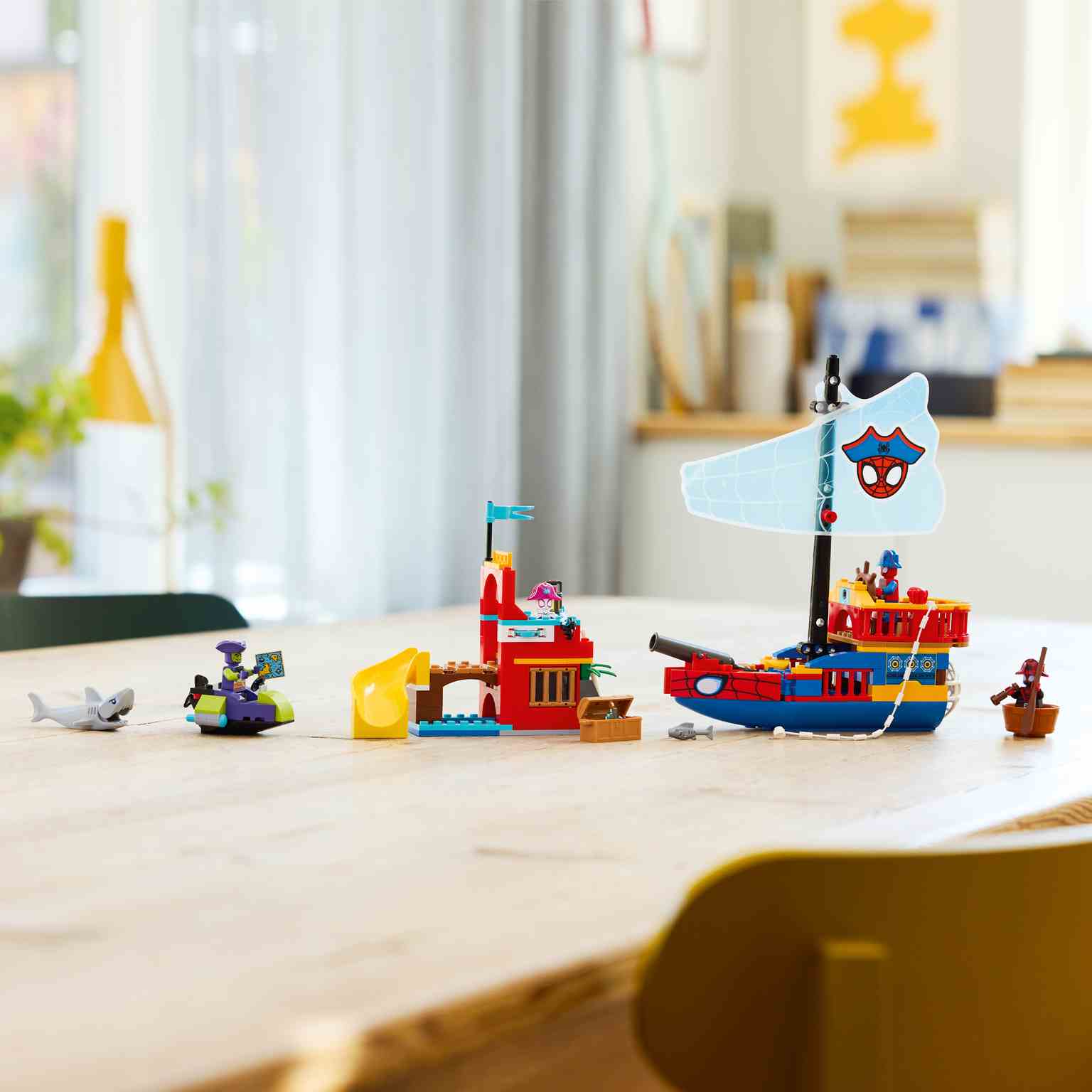 Este set incluye un barco pirata de juguete, un modelo de Spider Island con un tobogán, el barco del Duende Verde y un bote. Hay un cañón en el barco pirata, un lanzador de discos en la isla y cañones en el barco del Duende Verde. La cuerda arácnida de Spidey se puede usar para pescar un pez, un cofre del tesoro o el barco del Duende. Este regalo basado en Spider-Man para fans de la serie Spidey y su superequipo cuenta con coloridas instrucciones visuales, un ladrillo para principiantes y bolsas independientes con 1 modelo construible en cada una. Además, la app LEGO Builder ofrece acceso a sencillas instrucciones digitales.