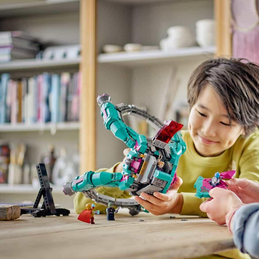 La Nave de los Nuevos Guardianes LEGO® Marvel (76255) pone en las manos de los niños la estrella de los viajes por el espacio de Guardianes de la Galaxia Vol. 3, de Marvel Studios. Diseñada para jugar y exponer, esta impresionante nave espacial llevará a los peques de 10 años o más a un universo de juego imaginativo. 3 naves espaciales en 1 Esta nave espacial construible es tan alucinante como parece. Cuenta con una cabina abatible para 3 minifiguras, un compartimento secreto para otra minifigura, espacios de almacenamiento para armas y accesorios, y 2 pequeñas naves que se separan de la nave nodriza. El set incluye 5 minifiguras de la película: Mantis, Drax, Star-Lord, Nébula y Adam Warlock. La nave se puede coger con facilidad para dar el salto al hiperespacio (por el salón…) en un instante. Después de jugar, quedará increíble expuesta sobre su soporte en la habitación de los peques. ¡A ellos también les espera más diversión en una dimensión digital con la app LEGO Builder!