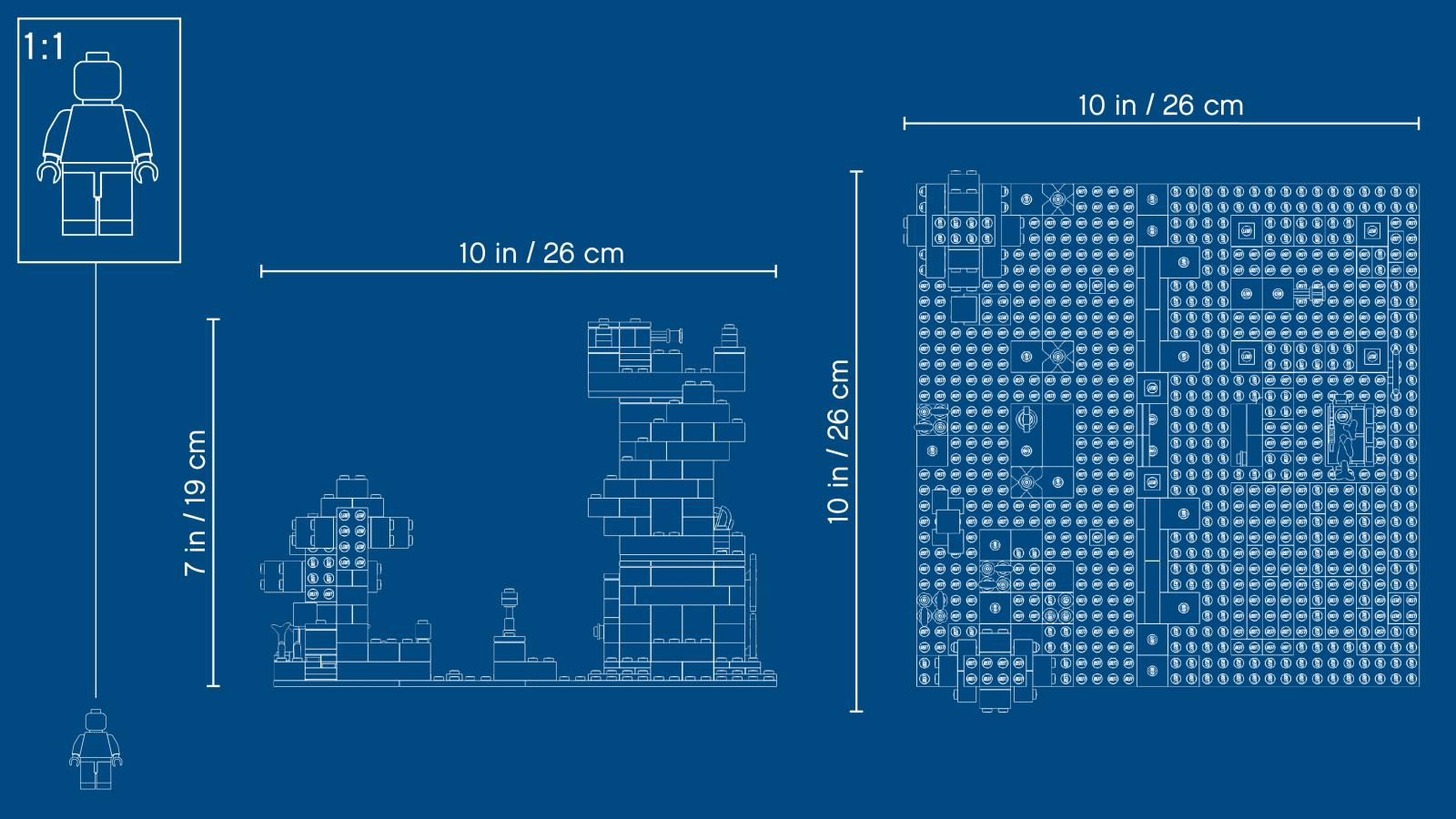 Con el castillo, que mide aproximadamente 18 cm de altura, 27 cm de anchura y 26 cm de profundidad, y la granja, que mide aproximadamente 16 cm de altura, 26 cm de anchura y 26 cm de profundidad, este juego ofrecerá la diversión del universo Minecraft™ a una escala de épicas proporciones.