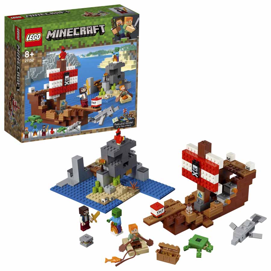 ¡Adelante, mis muchachos! Contempla tu nueva y fantástica piel de pirata Minecraft™ y vive emocionantes aventuras de piratas con Alex en la isla calavera del universo Minecraft. ¡Construye un temible barco pirata con detalles dorados, bandera pirata, pasarela, cañones e incluso un simpático loro! Carga los cañones del barco y protege a la tortuga y sus huevos del zombi errante. Coge después tu mapa y tu brújula, y sube a bordo del bote de remos para ir a pescar. ¿Te guiará el encantador delfín hasta un tesoro escondido? Cuando te apetezca un cambio, sólo tienes que reorganizar este set modular para crear una impresionante base tropical para piratas.