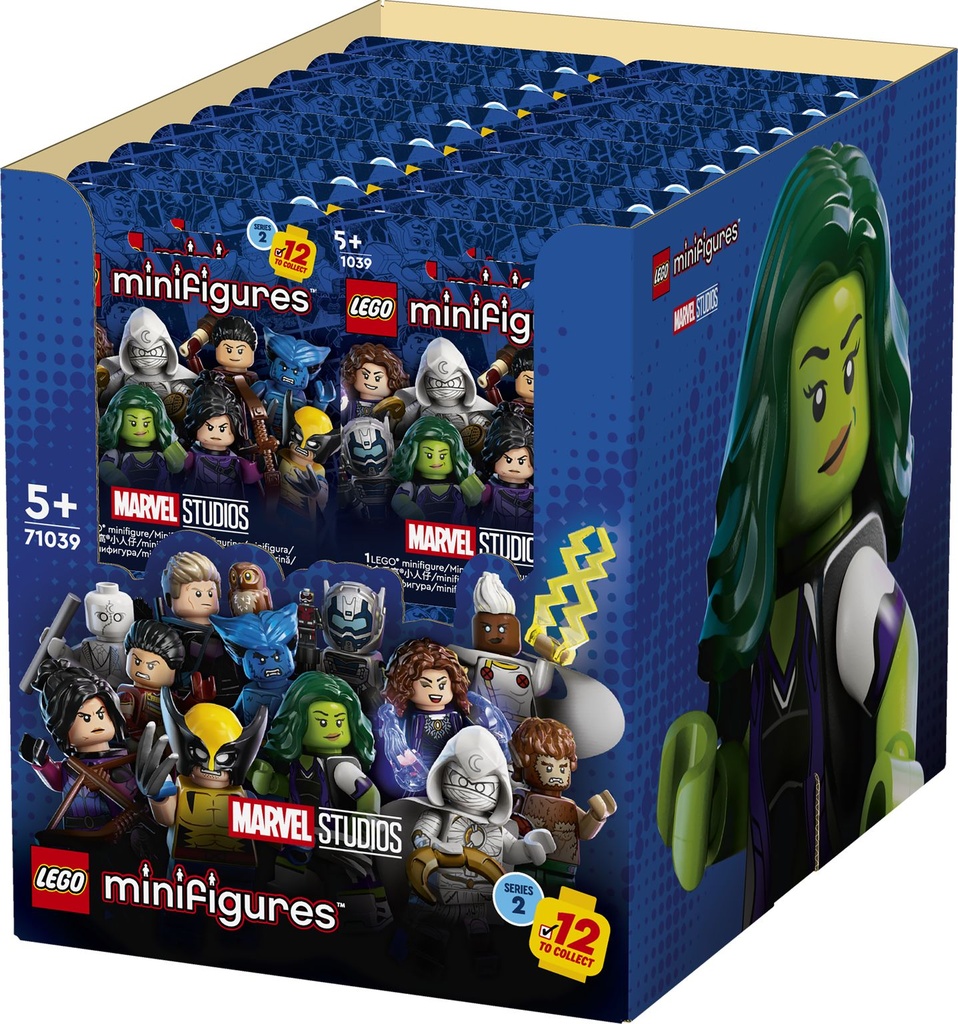Explora el trepidante mundo de Marvel Studios con estas cajas LEGO® Minifigures que contienen emblemáticos personajes de algunas de las series para Disney+ más populares de Marvel. Hay 12 exclusivas minifiguras para coleccionar, como Lobezno, el Caballero Luna, Hulka y Echo. Cada personaje viene con 1 detallado accesorio como mínimo. ¿A quién encontrarás en tu caja sorpresa?