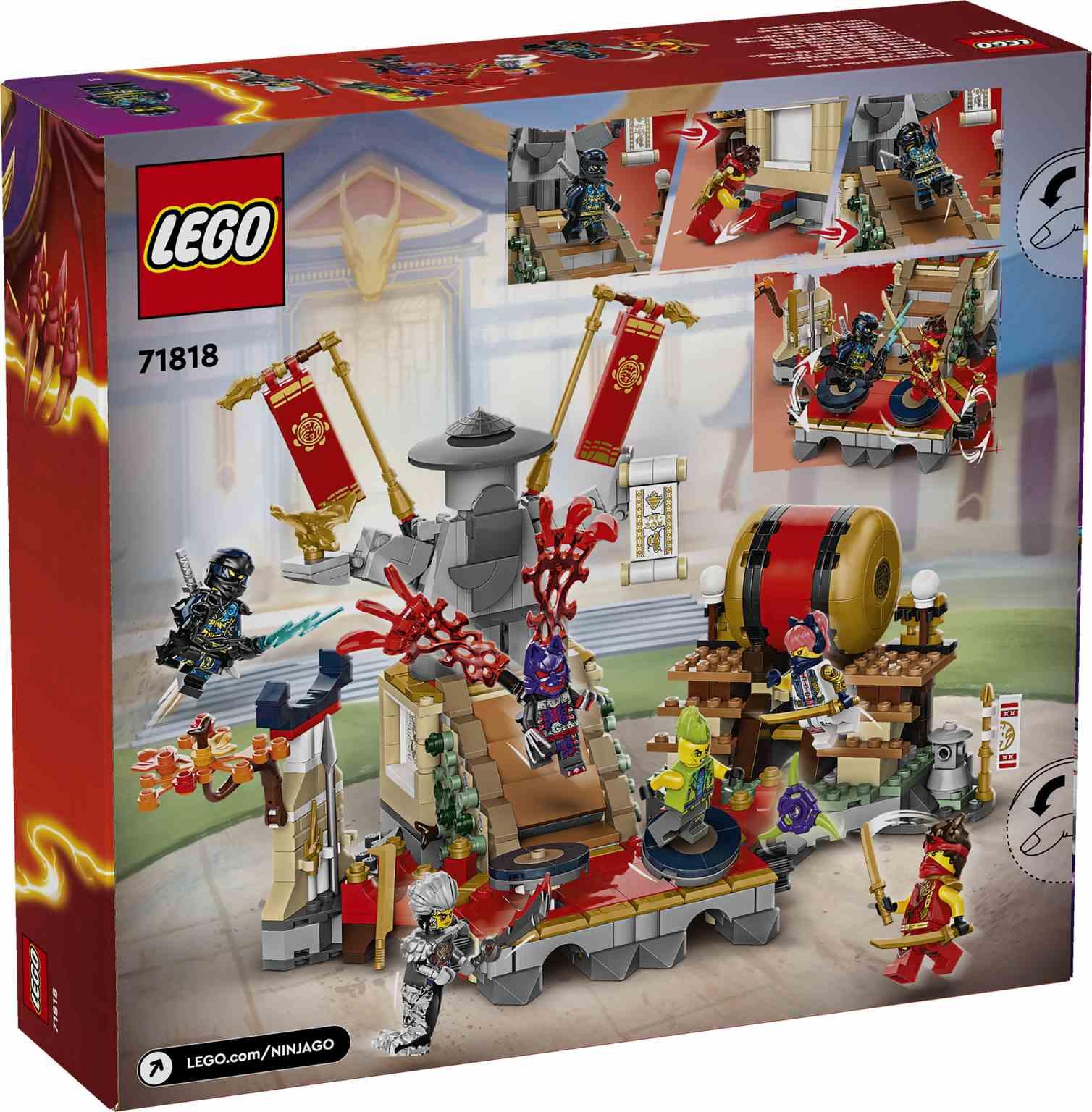 El detallado set Arena de Batalla del Torneo (71818) invita a los niños y las niñas de 7 años o más a recrear el espectacular enfrentamiento final de la temporada 2 de la serie para televisión NINJAGO®: El renacer de los dragones. Este juego de combate ninja incluye montones de características interactivas que proporcionarán muchas horas de diversión a los peques. Después, pueden convertirlo en un llamativo modelo de exposición para su cuarto. Este set LEGO® NINJAGO tiene 2 plataformas móviles listas para los trepidantes duelos entre los ninja y los villanos, un gran tambor que los niños pueden lanzar rodando hasta la arena y una escalera que se derrumba al tirar de una palanca, lo que provoca que cualquier personaje que esté en ella se precipite hacia abajo. El juguete ninja construible trae 6 minifiguras NINJAGO: los ninja Kai y Sora (con armadura para torneos y nuevas catanas cortas) y los villanos Cinder, un guerrero Máscara de Lobo y, en exclusiva para este set, Jay Malvado y Tox.