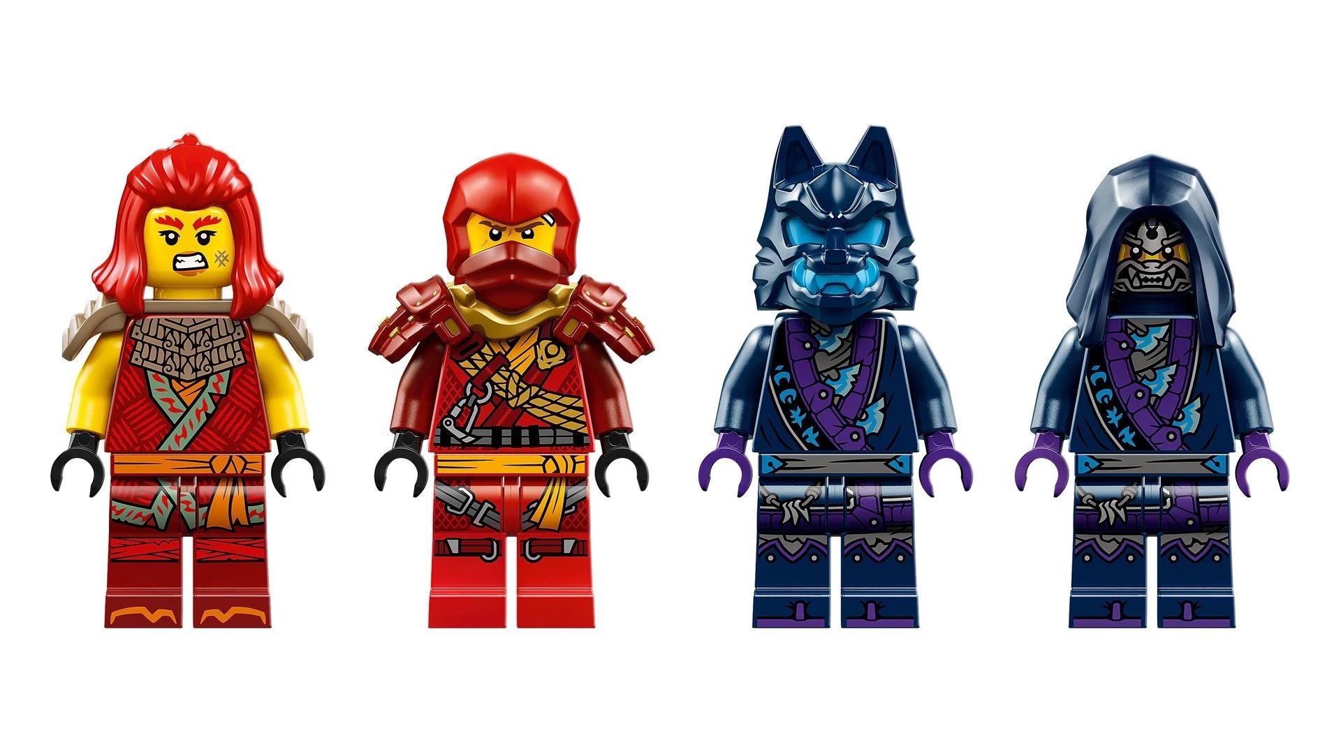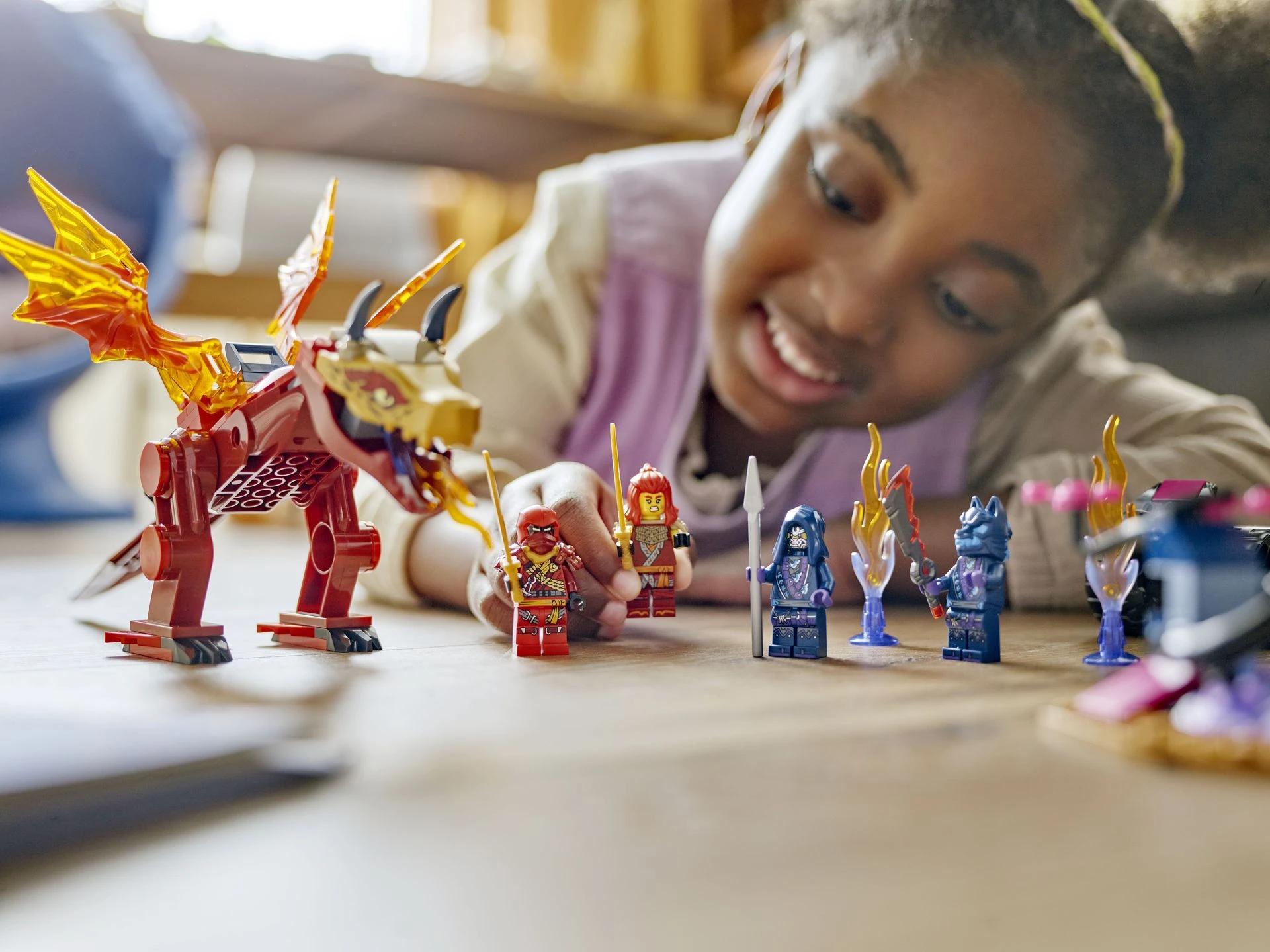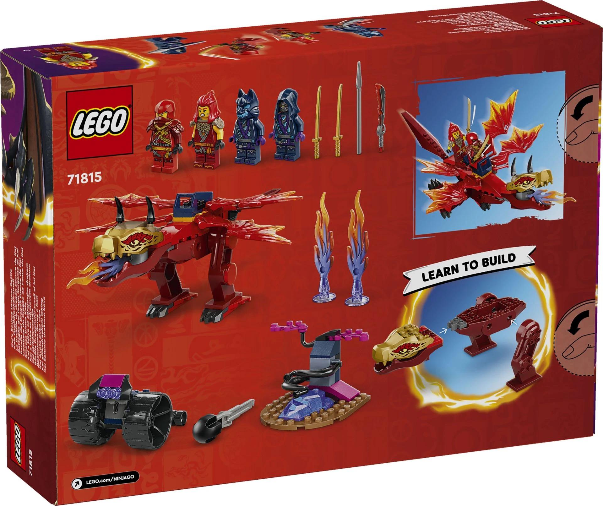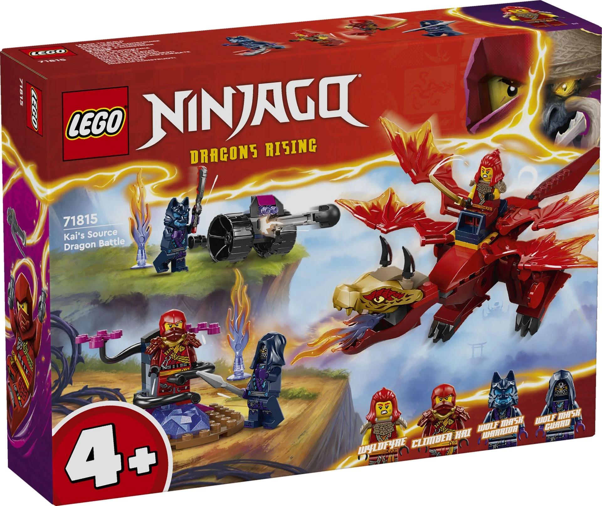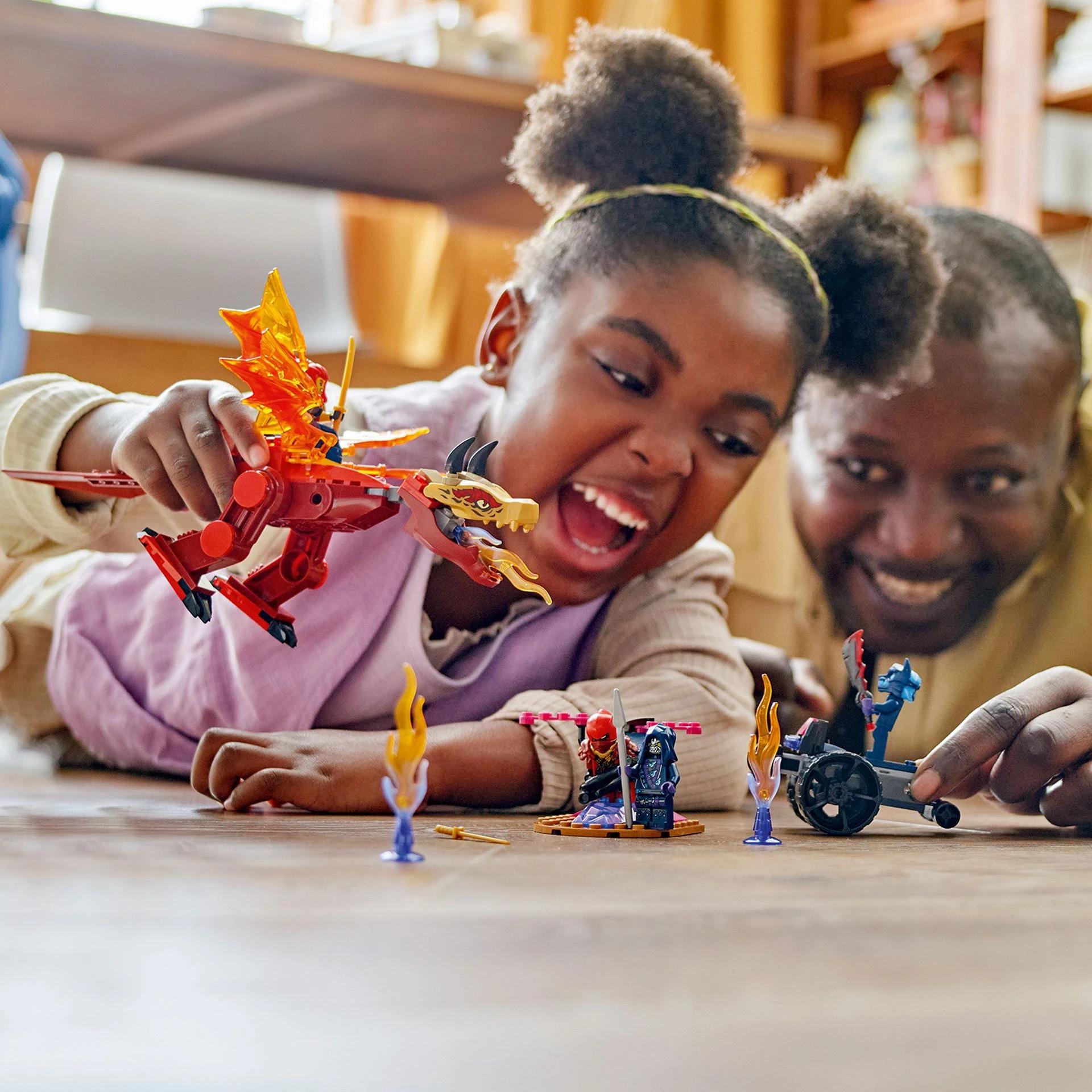 El juego de aventuras LEGO® NINJAGO® Batalla del Dragón Fuente de Kai (71815) ayuda a los niños y las niñas de 4 años o más a aprender a construir mientras disfrutan viviendo emocionantes historias ninja en el universo NINJAGO. Cuenta con un modelo de un dragón rojo con mandíbula, cabeza, cola, patas y 4 alas móviles que le permiten adoptar diferentes posturas. Los peques también pueden conectarle a la boca el elemento que representa una llama para asustar a los villanos. Este juguete de construcción LEGO incluye 4 minifiguras: Kai Escalador (con una catana), Wyldfyre (con una catana), un guardián Máscara de Lobo (con una lanza) y un guerrero Máscara de Lobo (con una espada). Además, contiene un minimodelo de un bosque donde quedan atrapados los personajes, un potente vehículo capaz de disparar una gran flecha y 3 pequeños elementos que representan llamas. Este set ninja proporciona una divertida experiencia a los niños de 4 años o más que empiezan a construir con ladrillos LEGO.