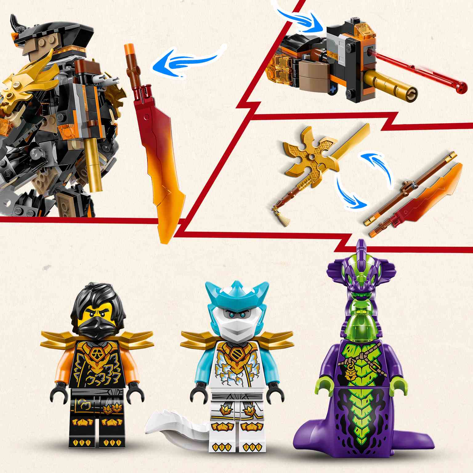 El meca viene con 3 armas ninja: una espada, un bastón y un lanzador automático con 2 dardos que los peques pueden intercambiar con las armas del set Dragón Ninja Riyu (71855), a la venta por separado. Este set también viene con 3 minifiguras LEGO NINJAGO: la figura de acción de Cole con un martillo, Zane Forma Dragón con una espada de juguete y un Monstruo Ácido con un bastón. El kit de construcción es un gran regalo para niños y niñas a partir de 7 años y fans adultos nostálgicos de la serie.