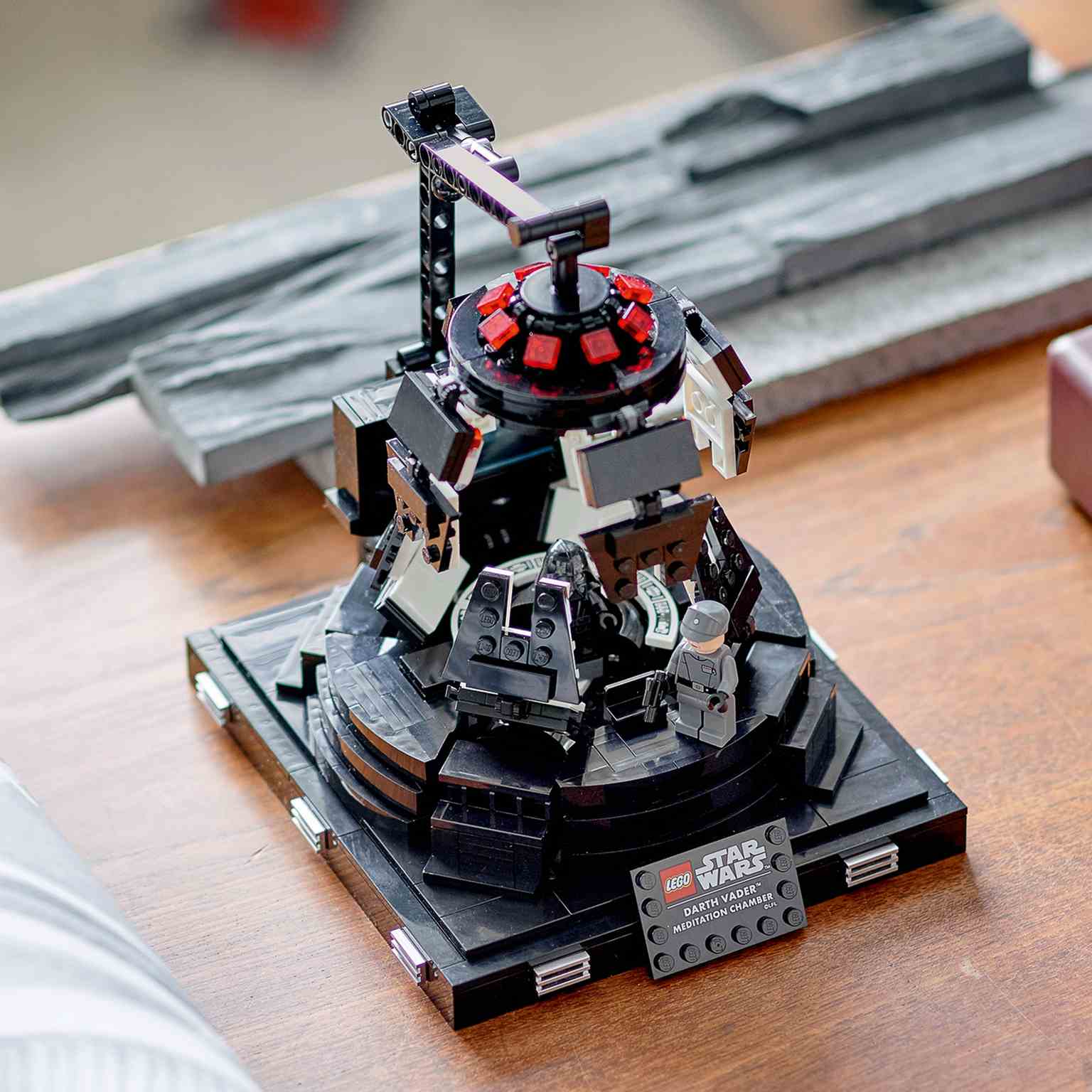 La cámara se abre y se cierra como la de verdad y, además, cuenta con un asiento giratorio para Darth Vader, una gran pantalla, paneles de control, una espiga para colocar de pie al General Veers y una placa decorativa.