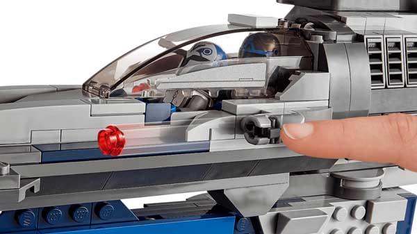 Únete a Bo-Katan Kryze y a un lealista Mandaloriano en emocionantes misiones a bordo del Caza Estelar Mandaloriano. Entra en la cabina doble y despega a toda potencia rumbo a las alturas. Despliega las alas y gira la cabina: con esa forma aerodinámica alcanzarás una impresionante velocidad de vuelo. Dispara los cañones a las naves estelares enemigas. Después, ¡equípate con pistolas bláster y mochilas propulsoras para librar trepidantes batallas contra Gar Saxon cuando aterrices!