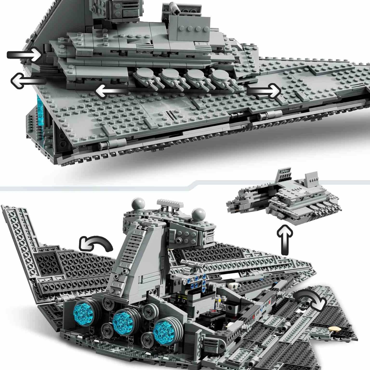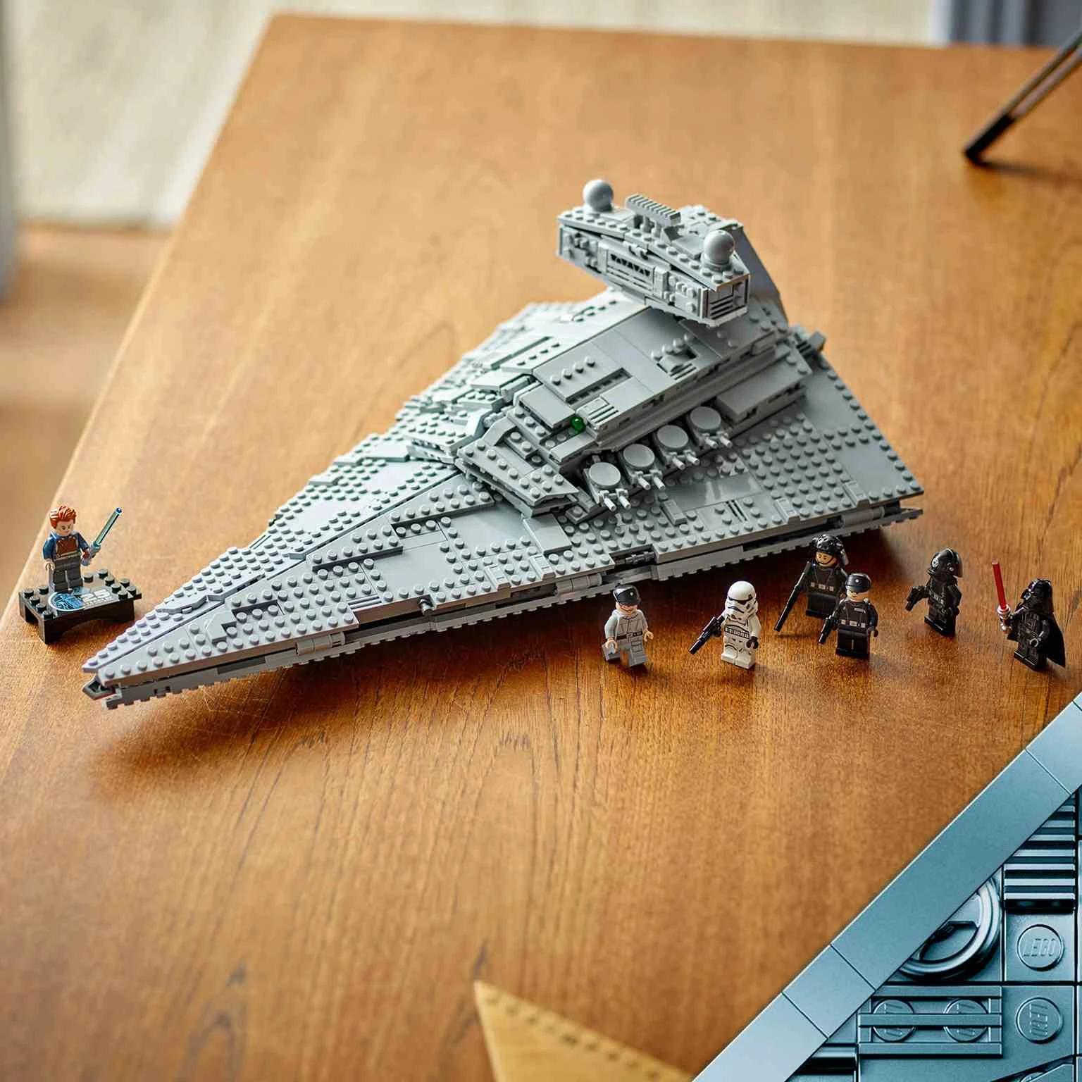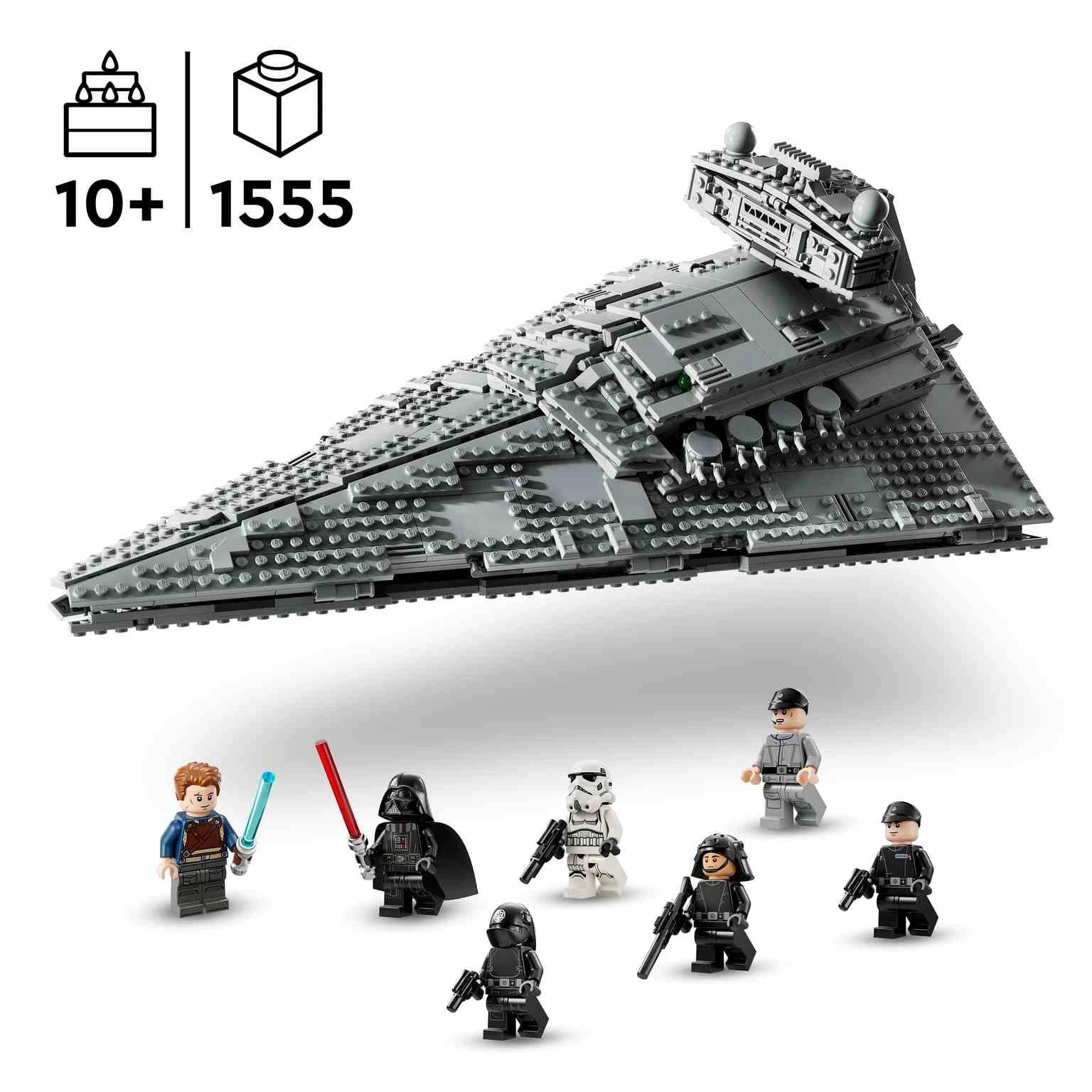 ¡Lidera el Destructor Estelar Imperial con Darth Vader! Traza un plan en la sala de mando con el Comandante Praji. Da órdenes al artillero imperial, el soldado de la armada imperial y el soldado de asalto. Dispara los cañones automáticos a las naves estelares rebeldes. Cumplida tu misión, expón la nave junto a una minifigura de Cal Kestis conmemorativa del 25 aniversario de LEGO® Star Wars™.