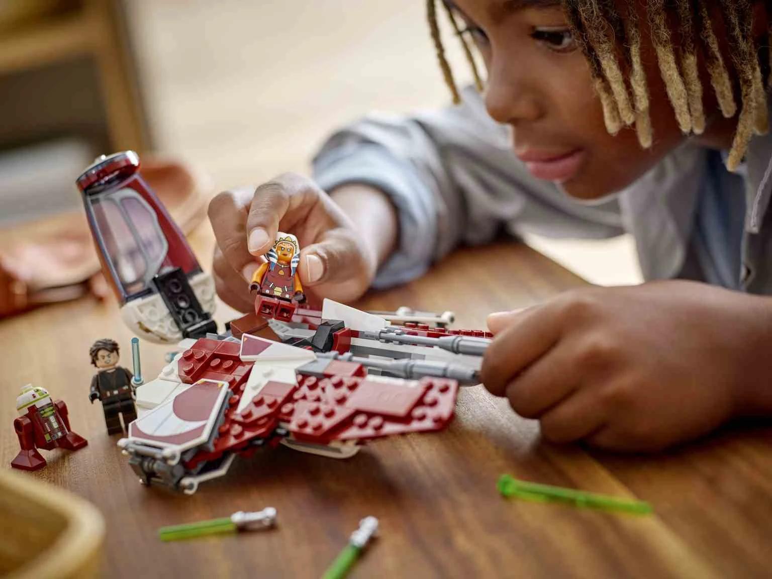 Anima a tu peque a crear sus propias aventuras de Star Wars: Las Guerras Clon con el juguete de construcción Interceptor Jedi de Ahsoka (75401). Este modelo LEGO® Star Wars™, una sensacional idea de regalo para niños, niñas y fans a partir de 8 años, está equipado con cabina abatible, alas ajustables a las posiciones de ataque y crucero, y 2 cañones automáticos. El juego construible incluye 2 minifiguras LEGO Star Wars (Ahsoka Tano y Anakin Skywalker con espadas láser) y una figura LEGO de un droide (R7-A7) para dejar volar la fantasía. Puedes colocar a Ahsoka en la cabina del interceptor Jedi, que también cuenta con espacio a bordo para R7-A7 y para las espadas láser de Ahsoka. Mejora la experiencia creativa de tu peque con LEGO Builder, una app que le permite acercar y girar una versión digital 3D de la nave estelar de Star Wars mientras la construye. Este vehículo de Star Wars de juguete puede combinarse con otros sets LEGO Star Wars (a la venta por separado) de la amplia gama.