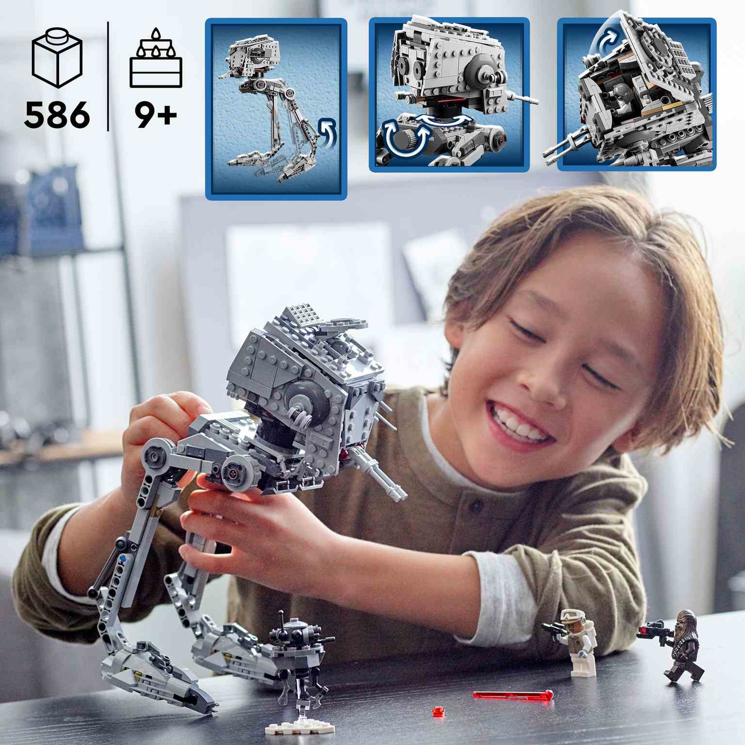 • Montones de inspiradores detalles: El caminante AT-ST cuenta con cabina para una minifigura (accesible por una escotilla y por la parte superior, que se abren), cabeza que gira al accionar una rueda, 2 cañones automáticos y patas articuladas